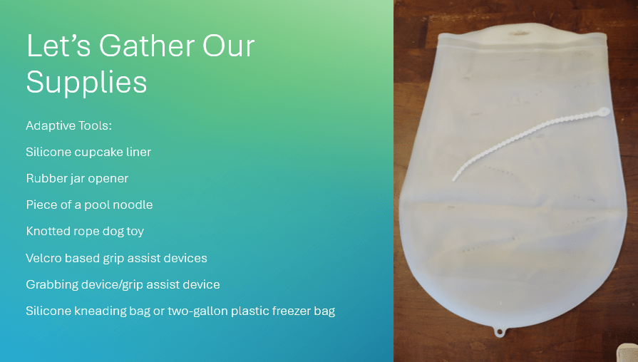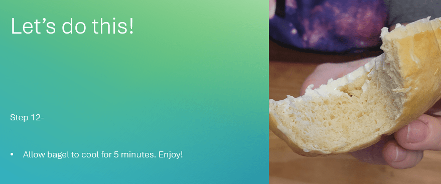 Situation: A person has spasticity, is paralyzed on one or both hands, has cerebral palsy, or has one way or another lost their grip strength in their hands that makes it difficult to prepare food. This person is making bagels.