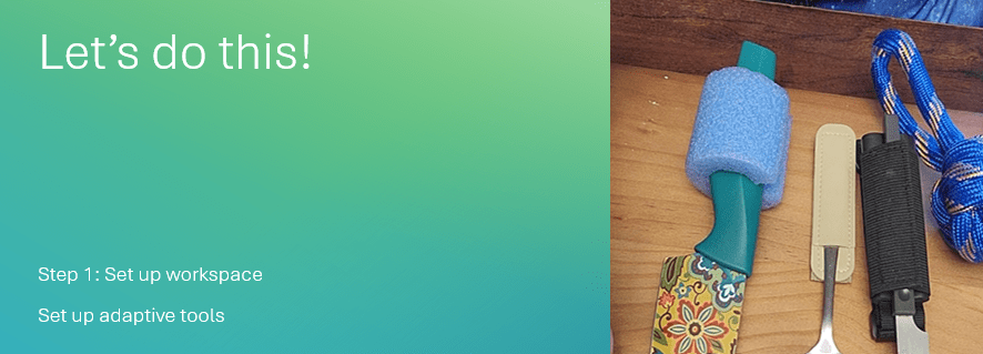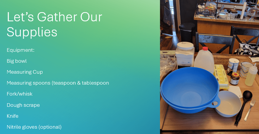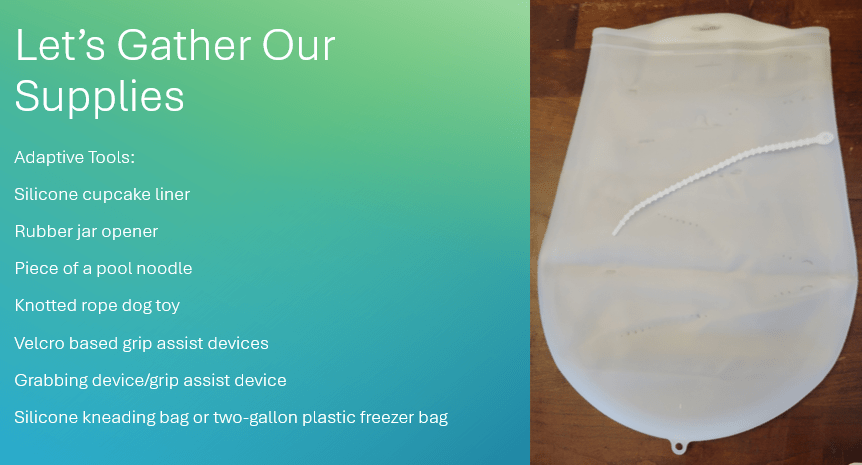 Situation: A person has spasticity, is paralyzed on one or both hands, has cerebral palsy, or has one way or another lost their grip strength in their hands that makes it difficult to prepare food. This person is making bread.